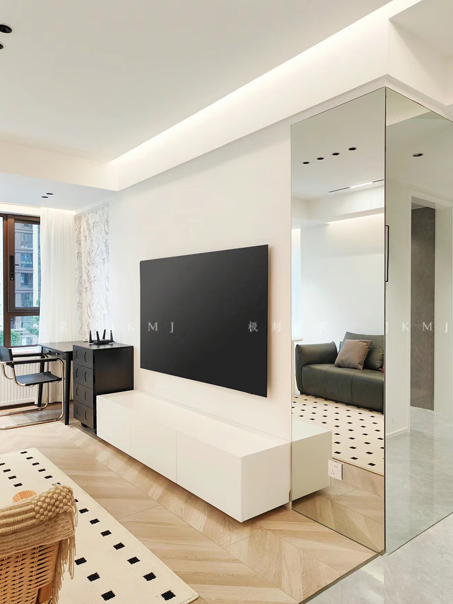 電視收納柜采用鏡柜設(shè)計(jì),視覺(jué)上整體空間更顯開(kāi)闊