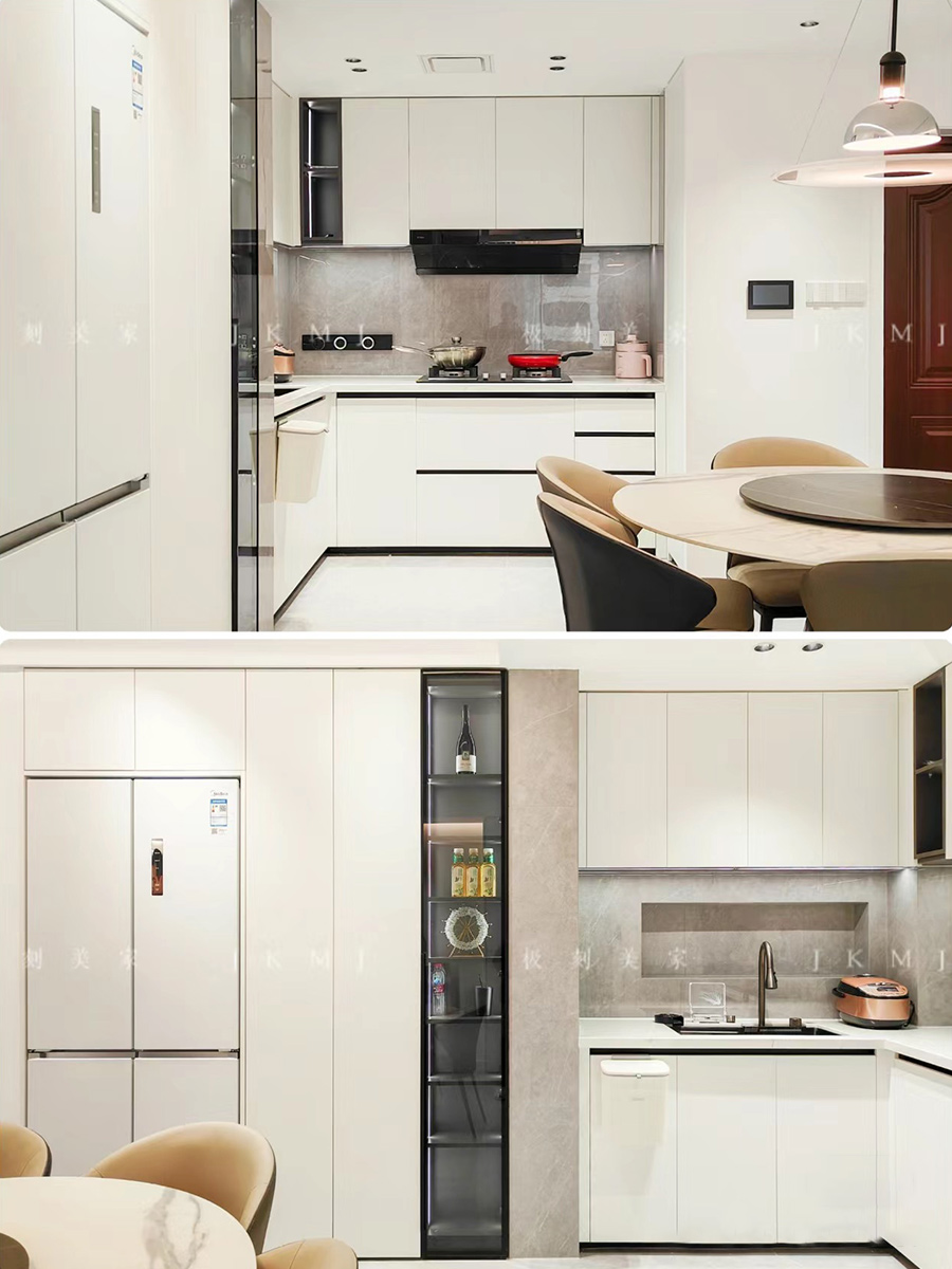 開(kāi)放式L型廚房設(shè)計(jì),冰箱采用嵌入式,收納與顏值并存